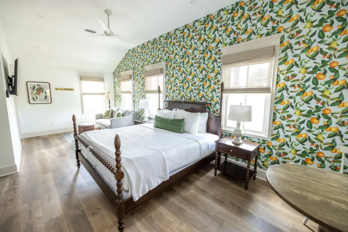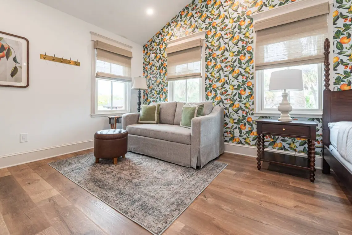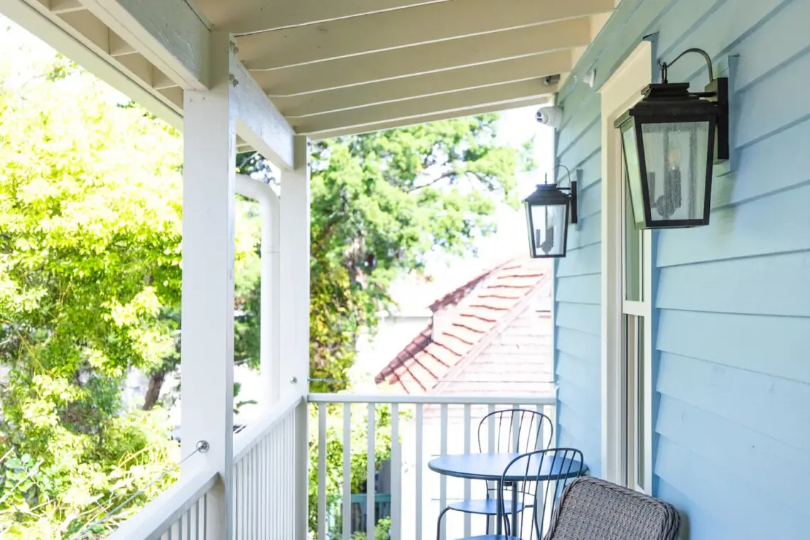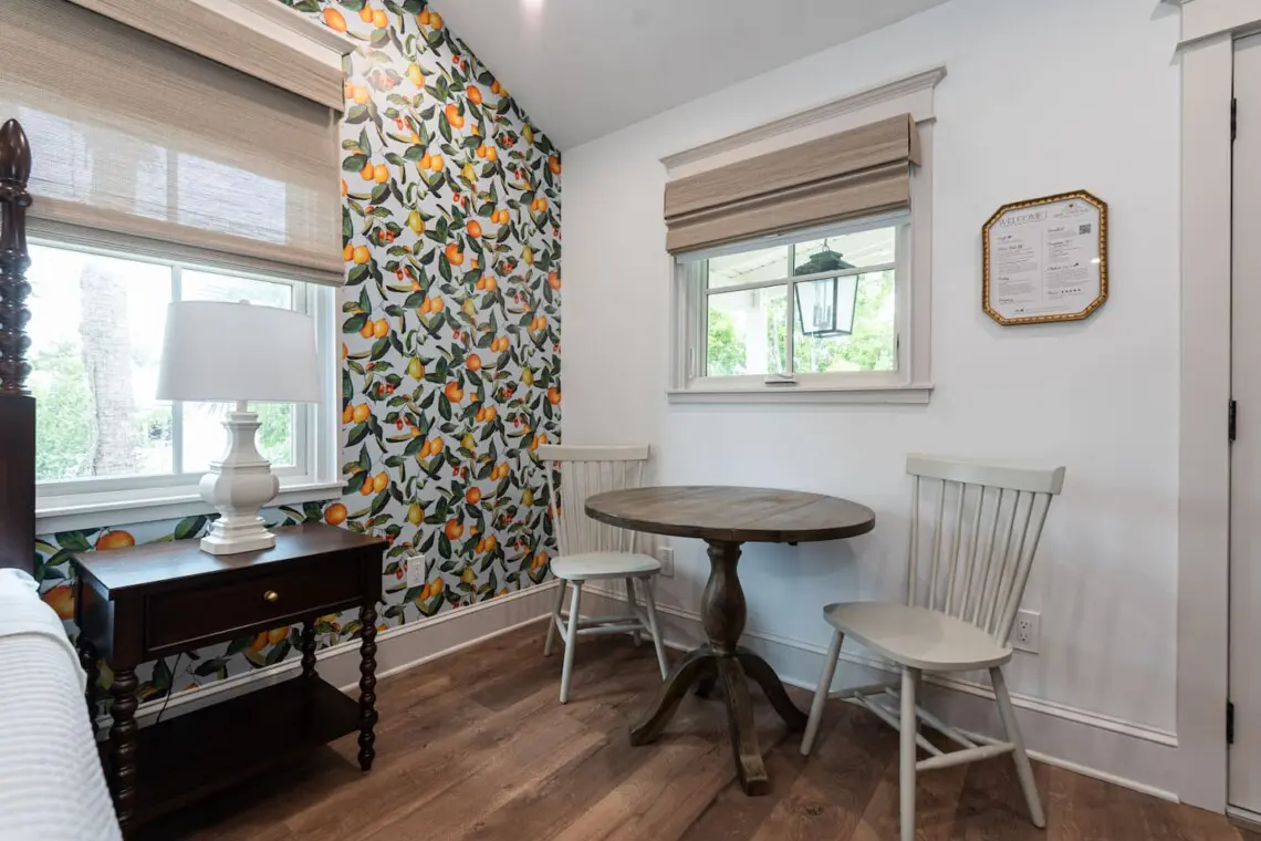 Room 02, the Citrus Room, is perched on the second floor of The Blue Carriage House and offers two convenient entrances. Guests can access the room via the front door and an interior staircase or through the private back entrance, reached by an exterior stairwell from the patio area.