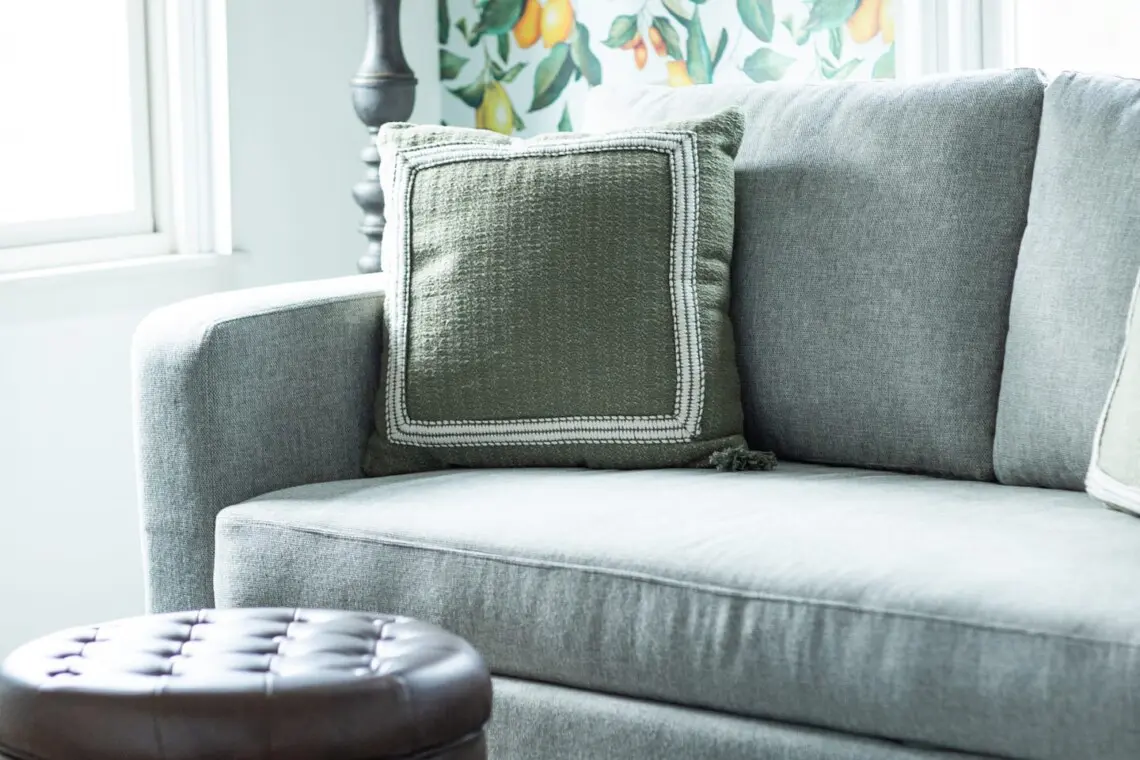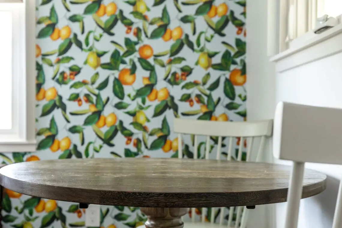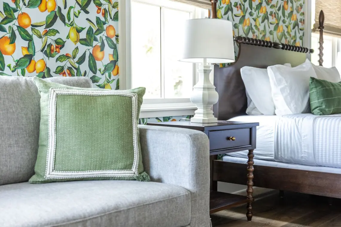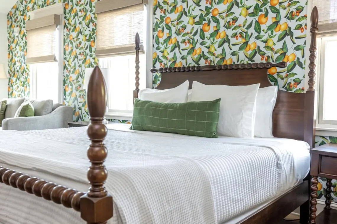 Room 02, the Citrus Room, is perched on the second floor of The Blue Carriage House and offers two convenient entrances. Guests can access the room via the front door and an interior staircase or through the private back entrance, reached by an exterior stairwell from the patio area.