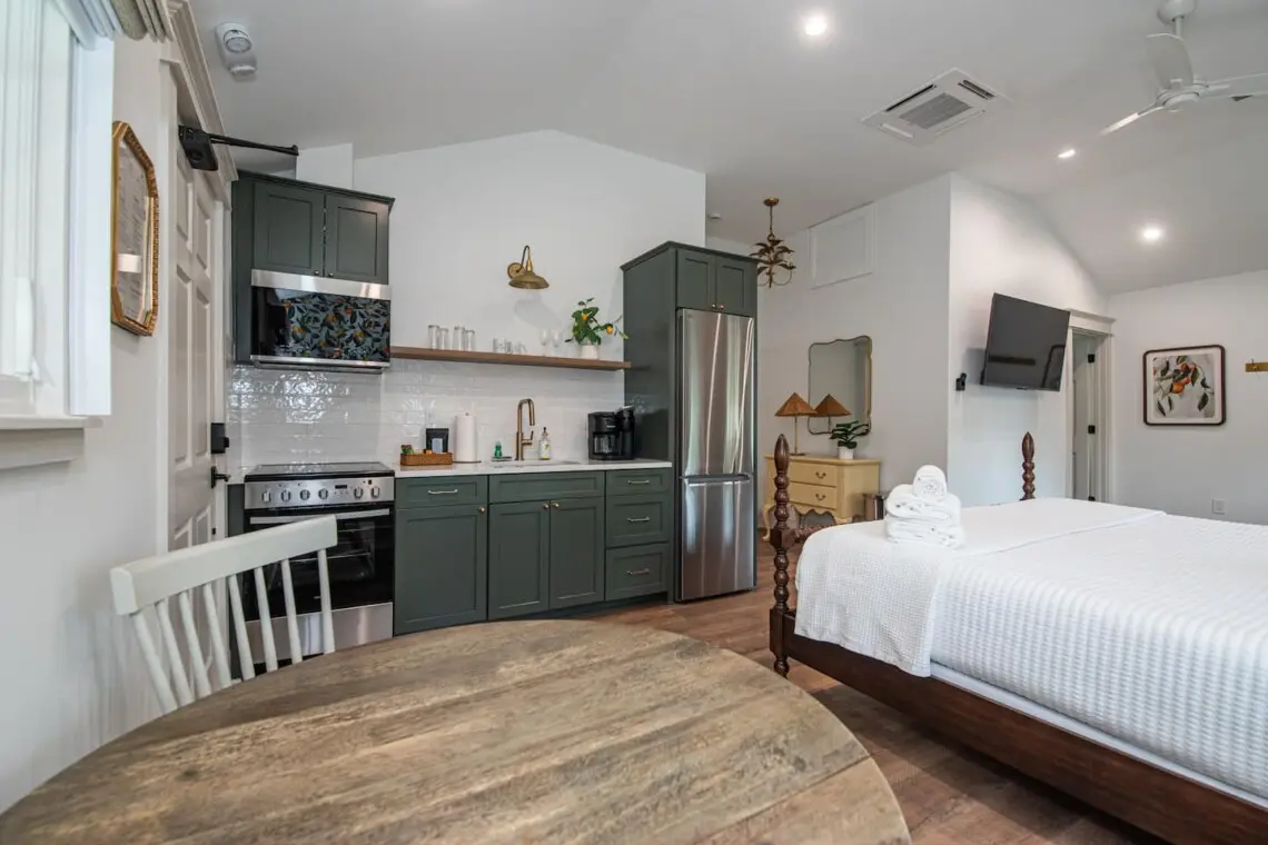 Welcome to the Citrus Room, a very special room at The Blue Carriage House! This vibrant suite features a 10′ ceiling, plush KING BED, a complete modern KITCHEN, double shower head and a private entrance. Located just one block from St. George Street, you’re a short walk to the Matanzas Bay riverfront, Castillo de San Marcos, and the Bridge of Lions. Infused with the zest of Florida’s citrus heritage, this room offers a bright and cheerful retreat for your Downtown, St. Augustine adventure!