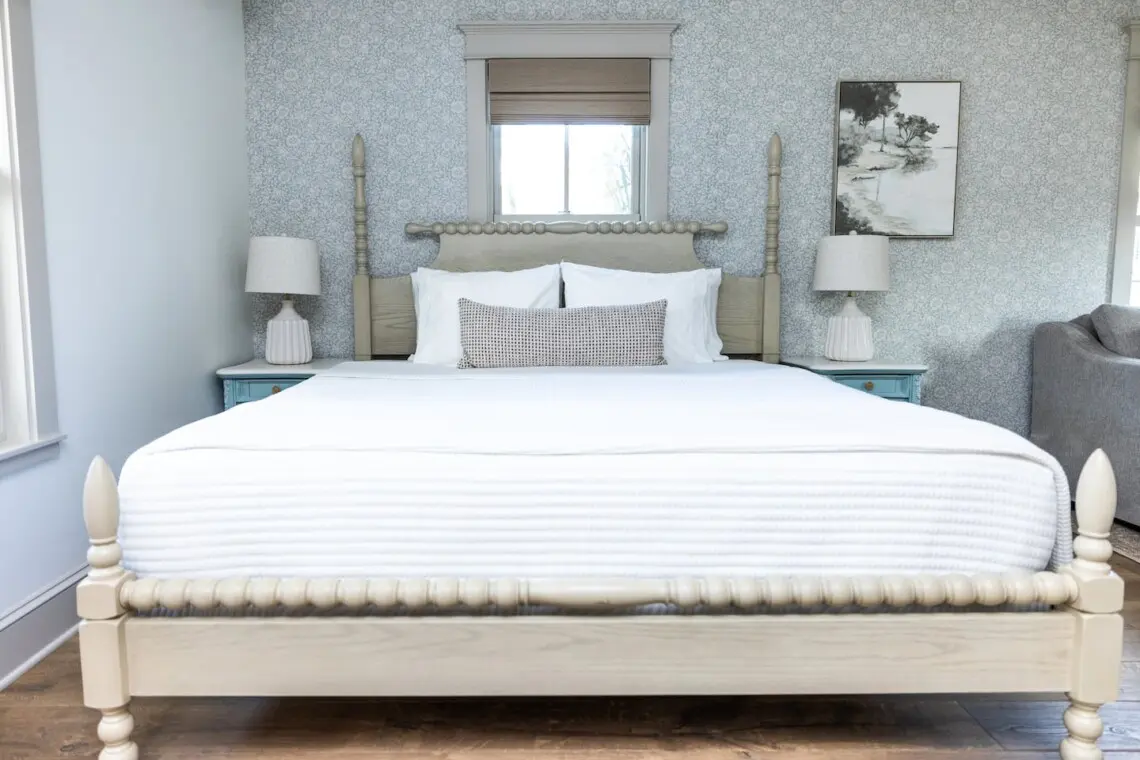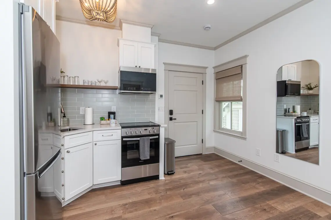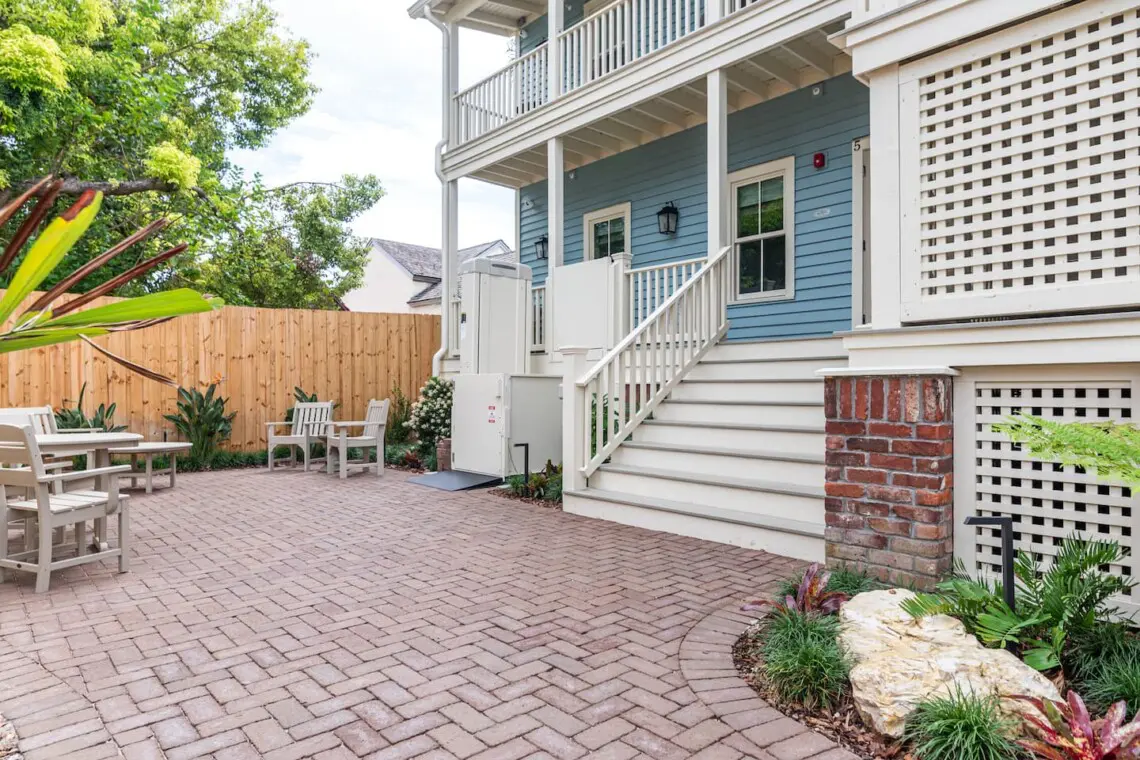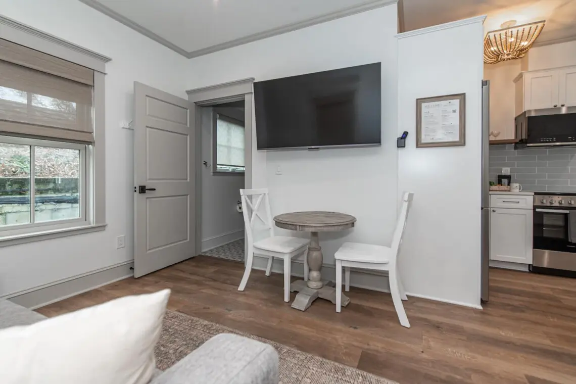 The Magnolia Room features a plush KING BEG, fully equipped KITCHEN, curbless SHOWER, and a sofa that folds out to a full-size bed. One on-site PARKING SPOT is included. Designed with ADA accessibility in mind, the room offers use of a wheelchair elevator outside, zero-threshold entry and grab bars in the bathroom. Located just one block from St. George Street, this serene retreat is perfect for everyone, with access to the Matanzas Bay, Castillo de San Marcos, and the iconic Bridge of Lions