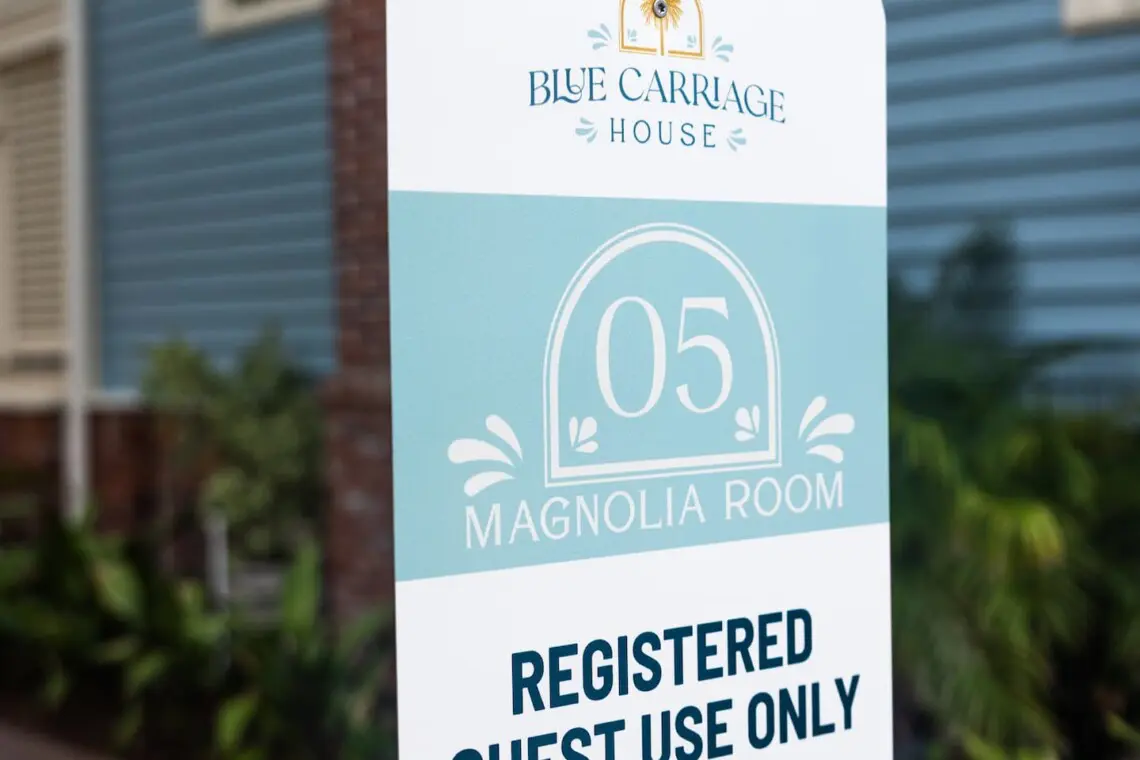 • Park in front of the sign labeled “05 Magnolia Room – Registered Guest Use Only”