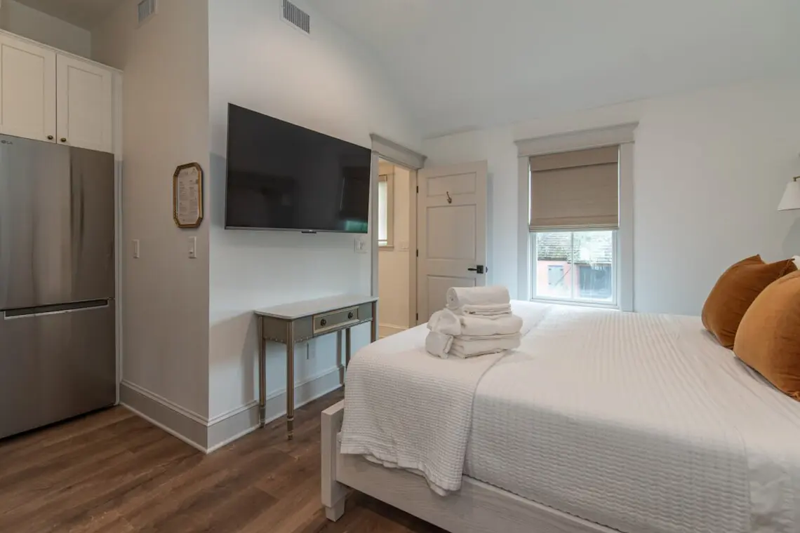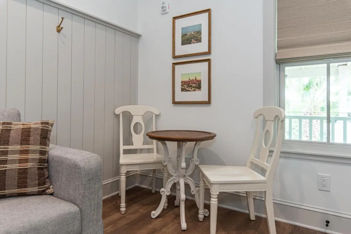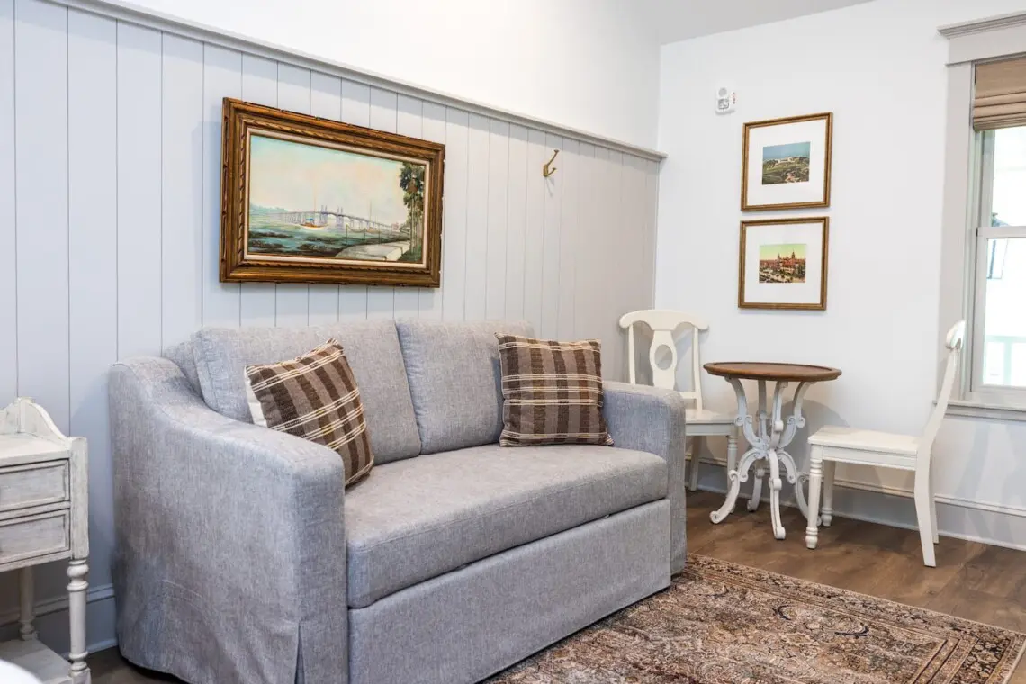 Welcome to the Flagler Room at The Blue Carriage House! This stately suite features a plush KING BED, a fully equipped KITCHEN, private BATHROOM and a Sofa-bed that folds out to a full-size bed. Unwind in the charming courtyard, outdoor seating, or cozy porch. Located one block from St. George Street, you’re minutes from the Matanzas Bay riverfront, Castillo de San Marcos, and the Bridge of Lions. Paying homage to Henry Flagler’s legacy, this room blends historic grandeur with modern comfort.